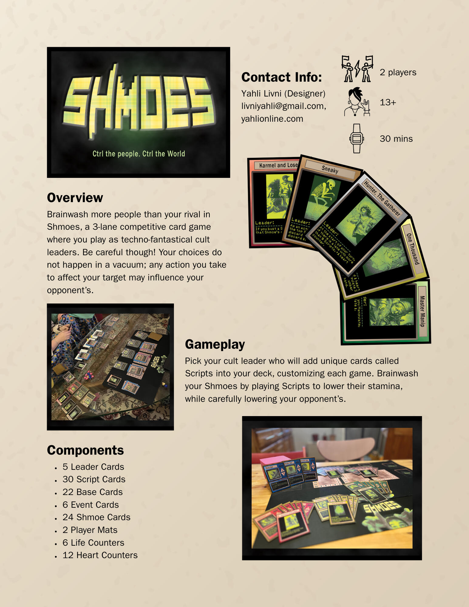 Overview: Shmoes is a 3-lane competitive card game in which techno-fantastical cult leaders compete to brainwash more people than their rivals. Be careful though! Your choices do not happen in a vacuum; any action you
